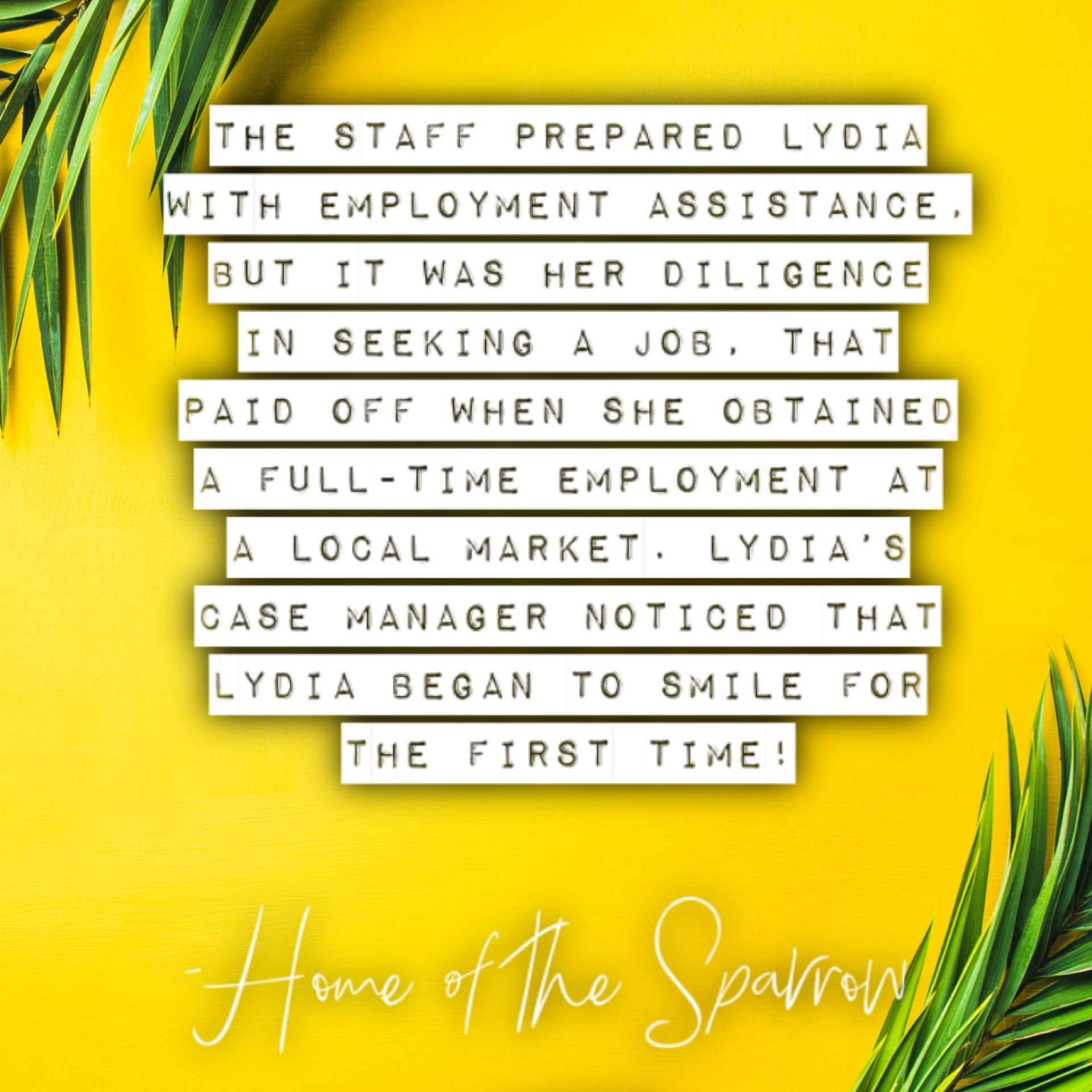 Home of the Sparrow places a strong emphasis on employment. The staff prepared Lydia with employment assistance, but it was her diligence in seeking a job, that paid off when she obtained a full-time employment at a local market. Lydia’s case manager noticed that Lydia began to smile for the first time! Lydia lived her new job, and began to show joy and pride in her position. Her job marked the end of her postpartum depression and the beginning of independence, as her self-esteem and sense of self-worth continued to grow.